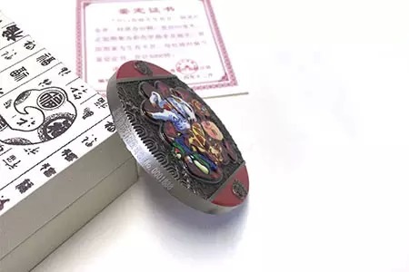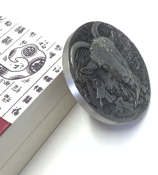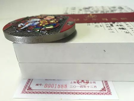 整个铜章由白铜压制而成,正面由彩色喷涂技术,硕大的红色福字在万花丛中很惹眼,福字上是身着彩装的孩童手持如意带着羊羔寓意着“吉祥如意”,铜章两侧是敞开并带有门环的红色大门,开门迎福、开门纳福便是如此。背面为本色,一只野山羊从浓密的牡丹丛中探出了头有种宁静与安祥。直径60mm、厚度6mm、材质白铜、发行量:3000枚、铸造单位:上海造币厂