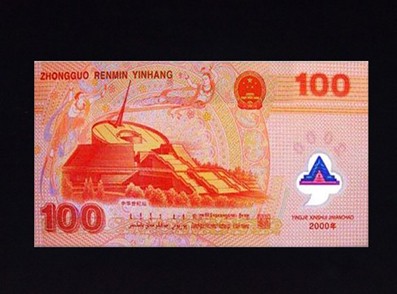 背面主景图案为迎接新世纪的代表性建筑——“中华世纪坛”。中华世纪坛是中国和北京纪元晋千的具有历史意义的重要标志,是集思想性、文化性、艺术性为一体的大型主要文化景观,是功能性和艺术性相结合,而以艺术性为主的纪念性建筑。它体现着20世纪末中国人民最高的艺术观念与追求。设计者为了达到和正面的升龙和谐媲美,腾飞一致,别具心裁地在中华世纪坛上空,在乾坤台圆盘“时空指针”的左右,各安置上一敦煌飞天图案。只见两个飞天仙女身穿纱裙,脖挂银铃,手带玉镯,肩挽彩绸,在世纪坛上空尽情地飞呀、唱呀、舞呀,寓意迎接千禧龙年隆重发行《钞》;加之底纹有敦煌藻井图案作衬景,有效地烘托出这座简洁、大方、庄重,富于时代感的博大建筑。从而凸现出《 钞》的集藏性、艺术性、纪念性与世界性。
