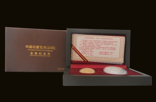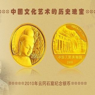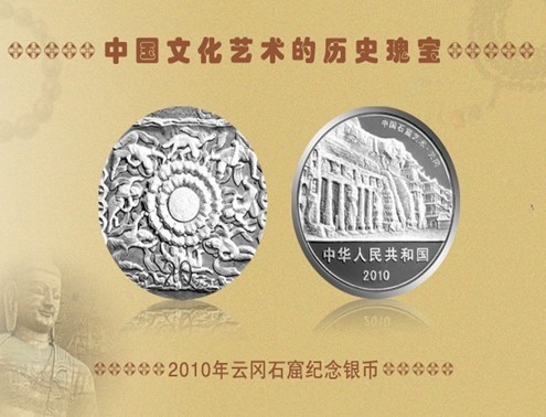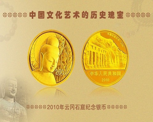 中国人民银行定于2010年8月发行中国石窟艺术(云冈)金银纪念币1套。该套纪念币共5枚,其中金币3枚、银币2枚。中国石窟艺术(云冈)金银纪念币是继敦煌莫高窟、龙门石窟和麦积山石窟之后,中国贵金属纪念币石窟艺术系列的最后一组。