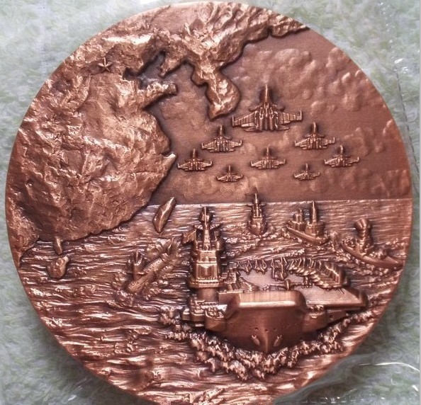 该铜章是中国军事题材系列的第二枚,大铜章正面图案为正在航行中的45度视角的“辽宁号”,舰载机正从航母起飞,航母右上方为金属镶嵌的海军军徽,下方刊有“中国第一艘航空母舰”的中英文字样。背面图案是由航母、潜艇、护卫舰、驱逐舰、补给舰和舰载机群等组成的气势宏大的航母战斗群。背景为中国大陆及海岸线,舰队行进方向背对大陆,寓意保卫中国领海,冲破封锁和岛链。