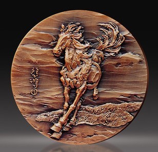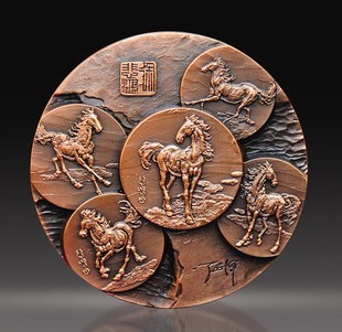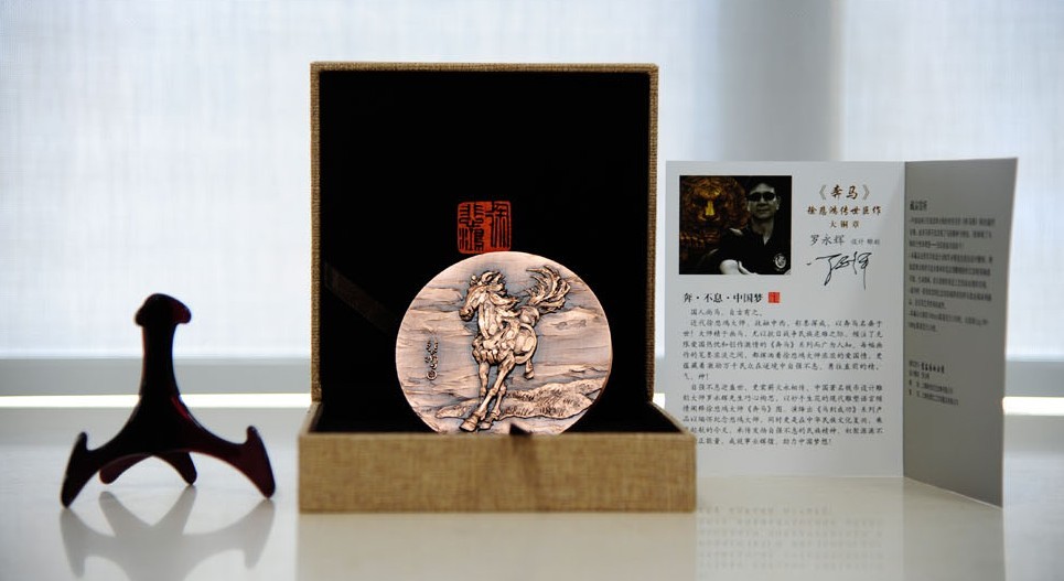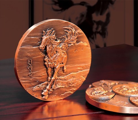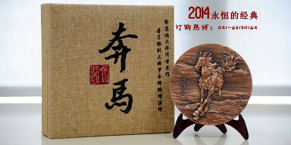 奔马大铜章由著名币章设计师罗永辉先生亲自设计雕刻,采用高品质紫铜精工铸造,直径100mm;厚10mm;限量1180枚。本款大铜章融聚名家巨制与当代名师技艺重塑,弥足珍贵,实属2014农历甲午马年的上选藏品;奔马大铜章还作为<徐悲鸿诞辰118周年国际艺术研讨会>的指定藏品,极具纪念和收藏价值!