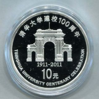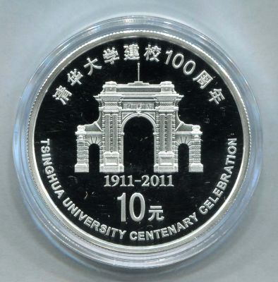 1盎司银质纪念币背面图案为清华大学“二校门”建筑造型, 并刊“清华大学建校100周年”中文字样、“TSINGHUA UNIVERSITY CENTENARY CELEBRATION”英文字样和“1911-2011”字样及面额。