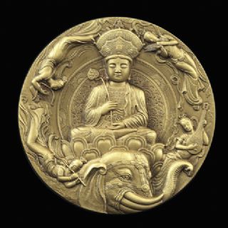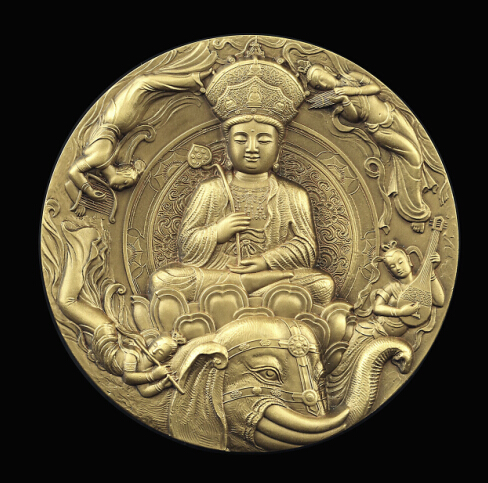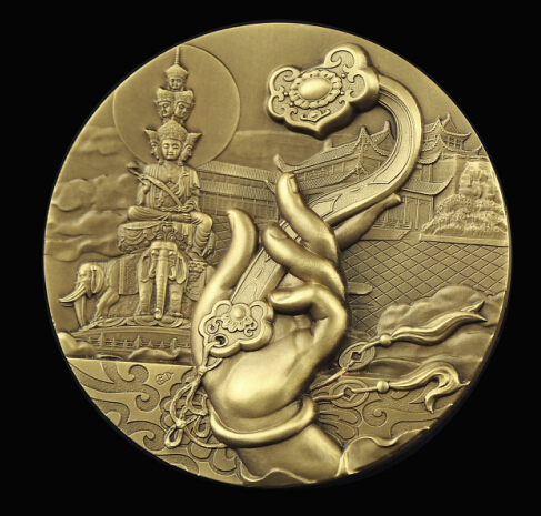“峨眉山”铜章由沈阳造币有限公司铸造面世,正面普贤菩萨身骑六牙白象造像为万年寺宋代造像,作为愿行广大、功德圆满的象征,已是峨眉镇山之宝。背景中环绕菩萨的四个飞天取自砖殿穹顶壁画,身姿轻盈,各持乐器,岁音乐陶醉其中;佛像中“普贤”代表“品德”,铜章背面金顶凝聚着峨眉山的最高境界,汇集了金殿、银殿、铜殿和十方普贤金象是世界汉传佛教朝拜中心和最壮丽的自然景观台。在金顶全景的映衬下,菩萨手持一柄大如意凸显而出,这是人们对美好和幸福的向往。峨眉山大铜章之中,传统与现代的艺术相结合,即弘扬峨眉山的无量佛法,又让人感受到佛教艺术升华的无限魅力。工艺考究,质量精湛,值得收藏!