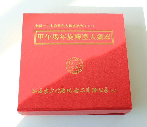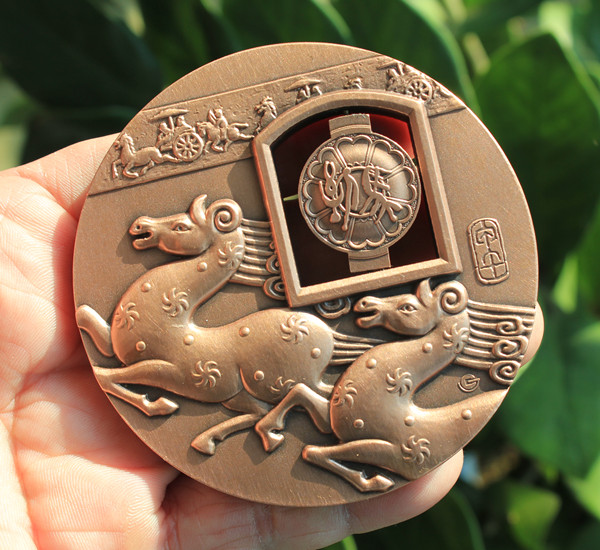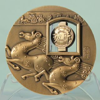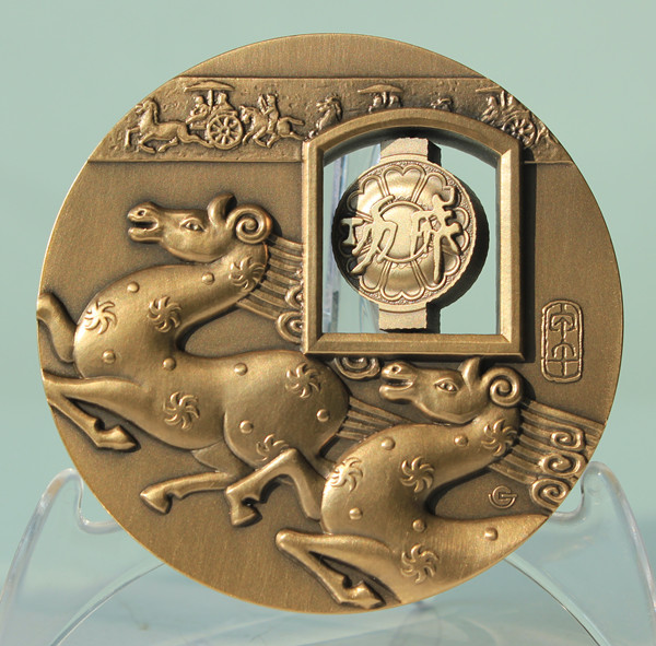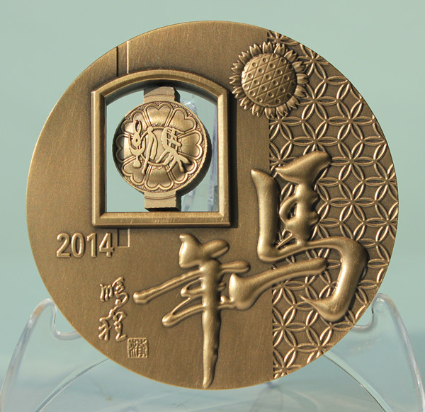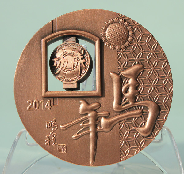 “马年旋转型大铜章”的最大亮点,是在画面上部特开一个小窗,内镶嵌了一枚可旋转的花朵小铜章,两面分别有“马到”与“成功”两字。主景分别为具有装饰画意的奔马与著名书法家蒲鹏程先生所书“马年”二字,象征着志在千里、勇往直前的精神。葵花图案,更有阳光、辉煌之意。此章发行量稀少,为中国首枚旋转(异型)生肖大铜章。