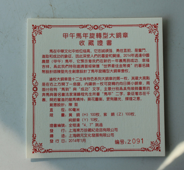 发 行 量: 黄铜100枚、紫铜100枚、纯银章10枚(大银章已全部售罄!)