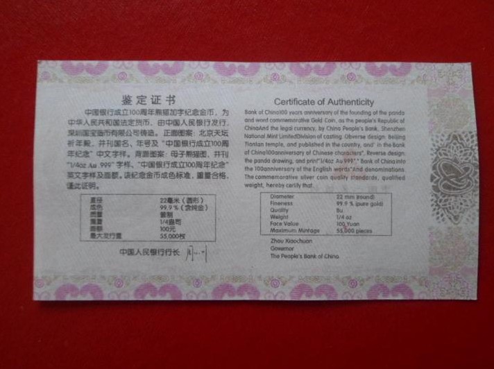 1/4盎司圆形金质纪念币背面图案为母子熊猫图,并刊“1/4oz Au .999”字样、“中国银行成立100周年纪念”英文字样及面额。