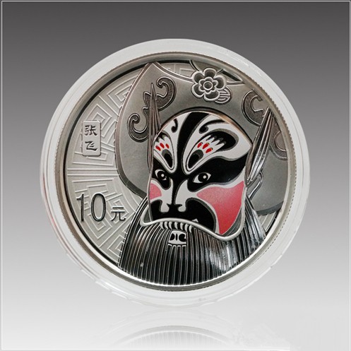 1盎司彩色圆形银质纪念币背面图案为纯朴耿直、爱憎分明、敢作敢为的“张飞”京剧脸谱造型(局部彩色),并刊“张飞”中文字样及面额。