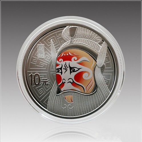 1盎司彩色圆形银质纪念币背面图案为武艺精巧、勤劳善良、风趣幽默的“陶洪”京剧脸谱造型(局部彩色),并刊“陶洪”中文字样及面额。