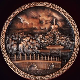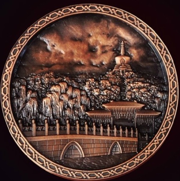 在中国传统里,紫色是尊贵的颜色,如北京故宫又称为“紫禁城”,亦有所谓“紫气东来”。该艺术铜章采用紫铜材质,显现皇家至高尊贵,弥漫着古色古香的味道。在色彩方面,工艺师将九龙及中间字体部分刷成高亮,而其余部分采用暗色处理,从而凸显出龙的神韵。通过色彩的浓淡处理,背面的北海公园让人有一种身临其境的感觉。