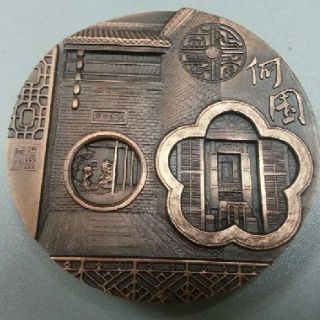 何园大铜章为紫铜材质,直径80毫米,厚约10毫米,正反面图案均采用浅浮雕工艺。铜章正面图案为寄啸山庄的建筑及西洋风格的门窗,体现了何园特色,背面则选用了何园西园、复道回廊、山石、荷花等。今年恰逢何园建园130周年,首发的何园大铜章颇具收藏纪念意义。