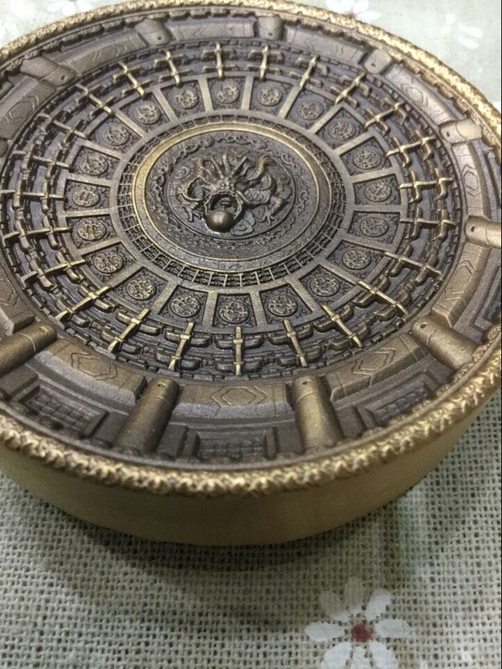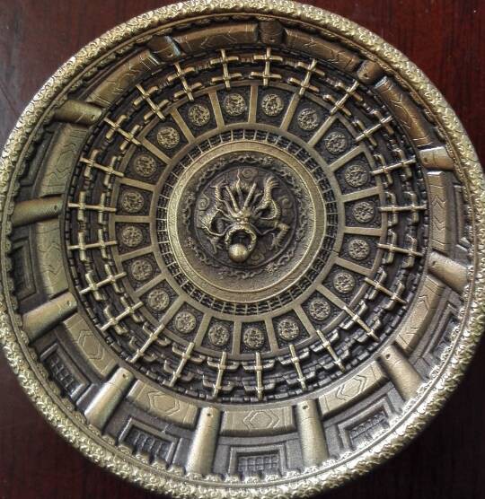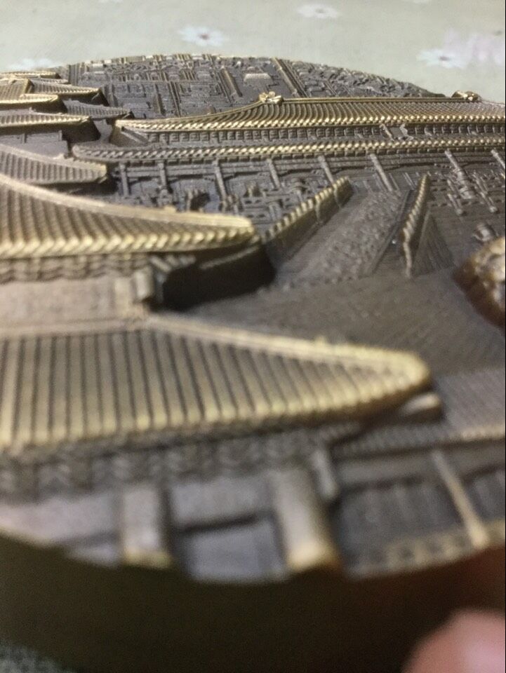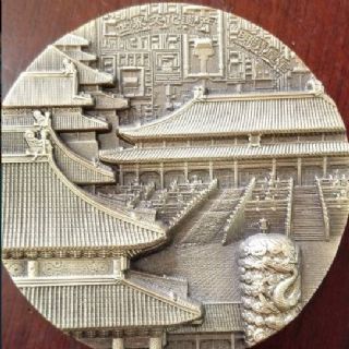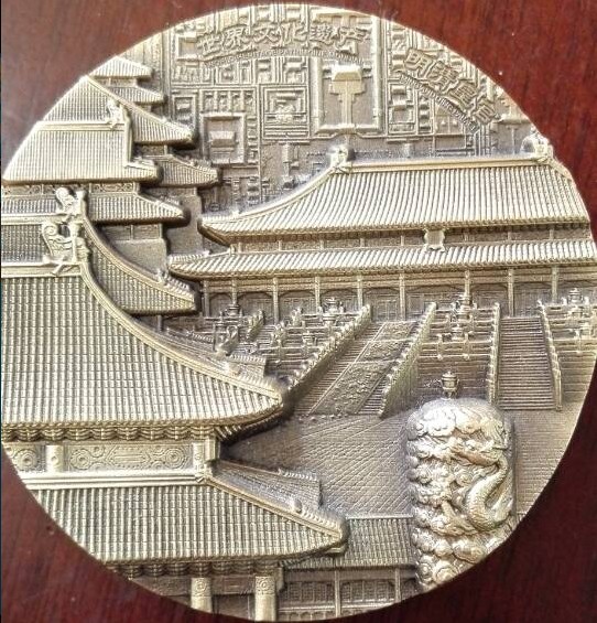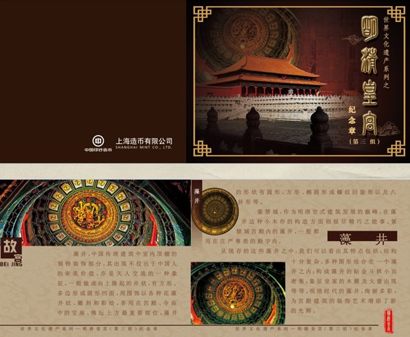 世界文化遗产系列之明清皇宫(第三组)纪念章由上海造币有限公司铸造。材质为黄铜,直径70毫米。正面图案左侧为北京故宫中轴线群体建筑侧轮廓叠加景深特写,右侧为北京故宫太和殿,背景饰以北京故宫总平面图(三大殿区);背面图案为北京故宫万春亭藻井。限量铸造1000枚。