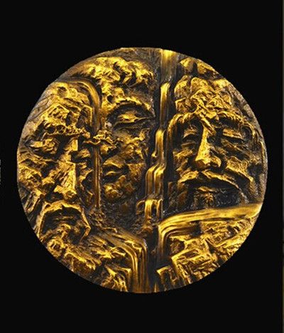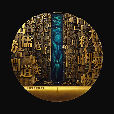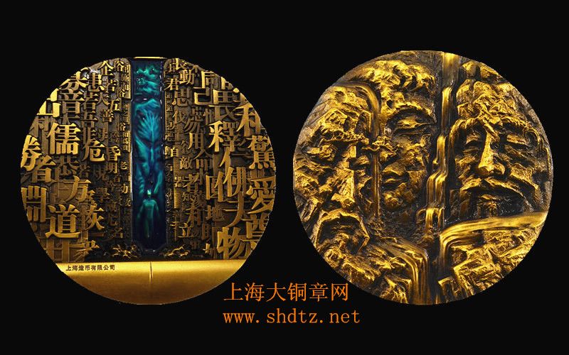 “中国传统文化系列之‘和’大铜章”。正面图案为以抽象及拟人手法刻画儒、释、道的核心人物孔子,老子,释加牟尼的形象,诠释“仁”,“义”,“德” ,“法”,“礼”等三教宗旨山高之不可逾越之意,一条瀑布由上至下汇入溪流;背面图案与正面瀑布贯穿而下之景相呼应,融合了天地间的植物、百兽及人,周围饰以“儒、释、道”三家的法礼、教义等文字。