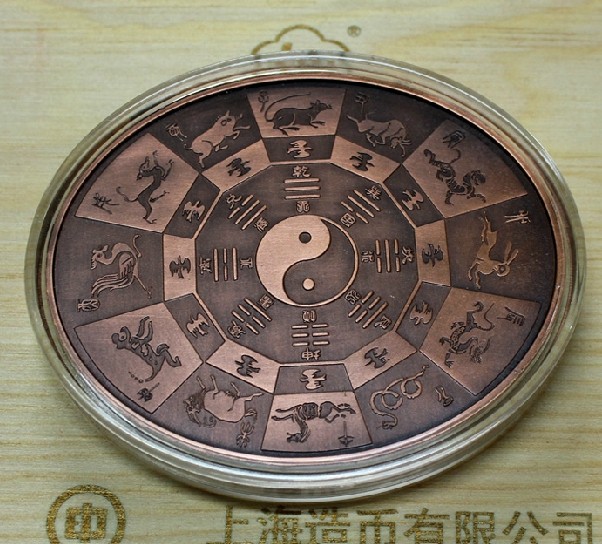 背面:图案为十二生肖以及周易八卦图。