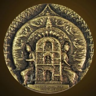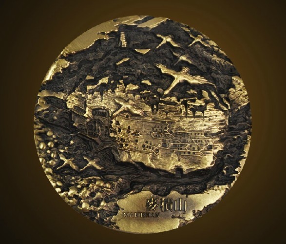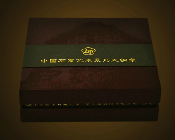 麦积山石窟大铜章正面为麦积山的鸟瞰图,突出部分为麦积山的山体,凹陷进去的为森林山川河流,正面采用明暗对比手法,使得麦积山的立体感非常强烈。背面石窟部分取材于麦积山的经典石窟画面,采用中国传统建筑中的对称设计手法,给人以美轮美奂的印象。该铜章整个浮雕画面多达数层,更人感受到石窟艺术的震撼力。唯美的造型,强烈的色彩反差,精致的高浮雕,堪称大铜章中的精典之作。