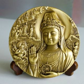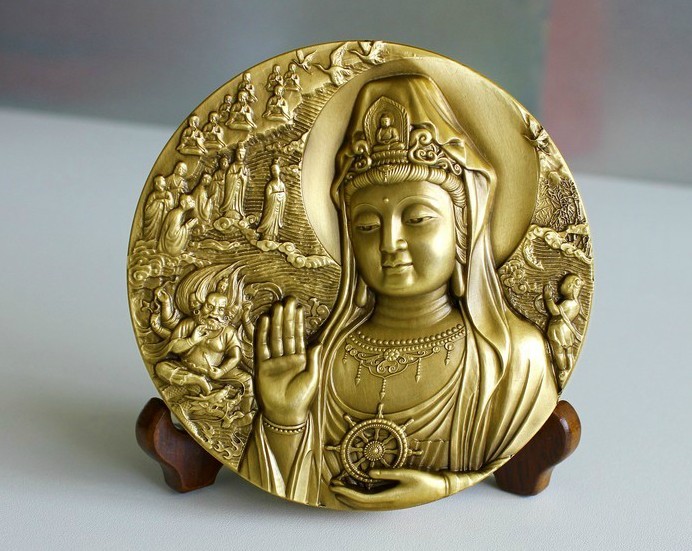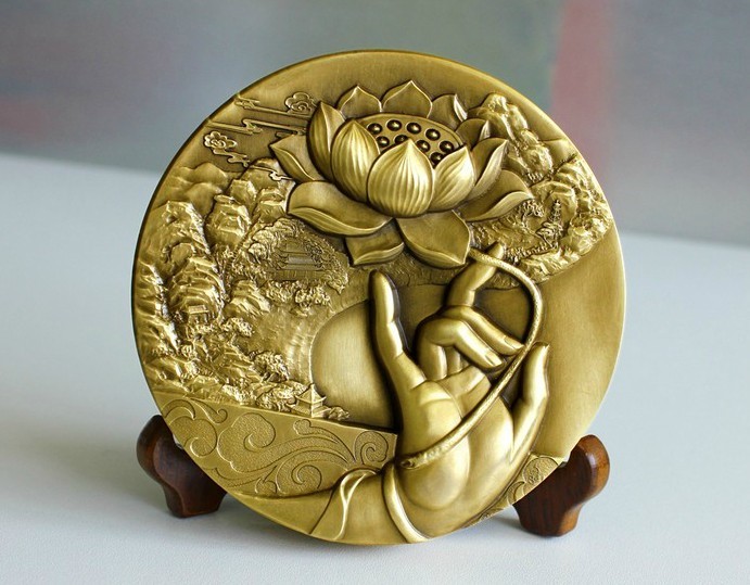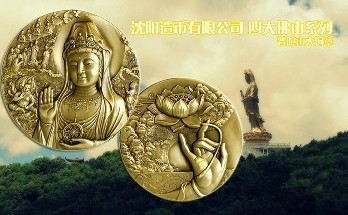 晨钟暮鼓感化名利客,佛号经声催醒迷梦人。普陀山大铜章正面图案为南海观音佛像,降龙罗汉,众妙相菩萨与观音弟子。其人物刻画惟妙惟肖,祥云仙鹤意境高雅。南海观音左手托法轮,右手施无畏印,妙状慈祥,令信众瞻礼获福,得大吉祥。大铜章背面图案为菩萨手执莲花,背景为普陀山圣境景观;莲花乃佛教吉花,尽显身、语、意境之清净光明。 “普陀山”大铜章展示了“中国佛教名山”的殊胜仙境,再现了“观音道场”和“海天佛国”的幽静神秘。其寺塔林立,梵音美妙,令有佛缘之人心驰神往。有幸收藏此章者,大则祈祷国泰民安,风调雨顺;小则修行佛学,祈福迎祥。乐之,幸之。