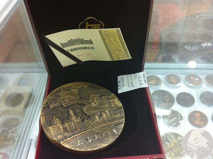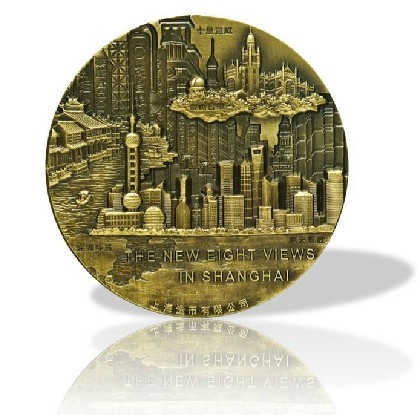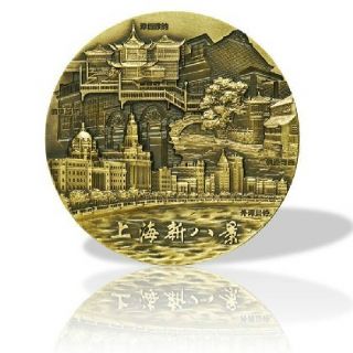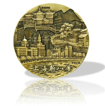 大铜章的正面图案中外滩(外滩晨钟)、枫泾(枫泾寻画)、豫园(豫园雅韵)采用阳纹浮雕,而新天地(旧里新辉)则采用阴文凹雕;背面图案中的陆家嘴(摩天揽胜)、朱家角(淀湖环秀)、佘山(佘山拾翠)同样采用阳文浮雕,而南京路步行街(十里霓虹)也采用阴文凹雕。凹凸画面构图饱满,层次丰富;阴阳雕刻富有变化,错落有致。把“上海新八景”的八个画面巧妙融入一枚大铜章内,浑然一体。雕工精美颇具玩味珍藏价值。